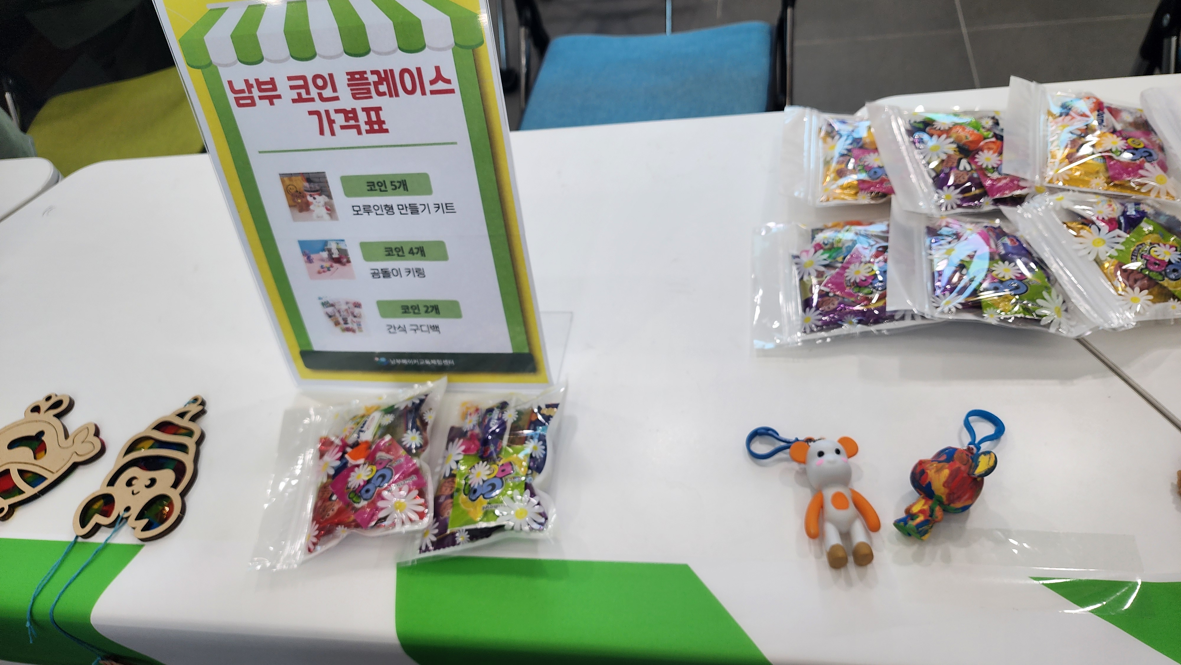 수업이 끝난 후, 아이들에게는 나무로 된 코인이 한 명당 2개씩 주어졌습니다. 이 코인들은 1층 부스에서 자신이 원하는 상품이나 간식으로 교환할 수 있었습니다.