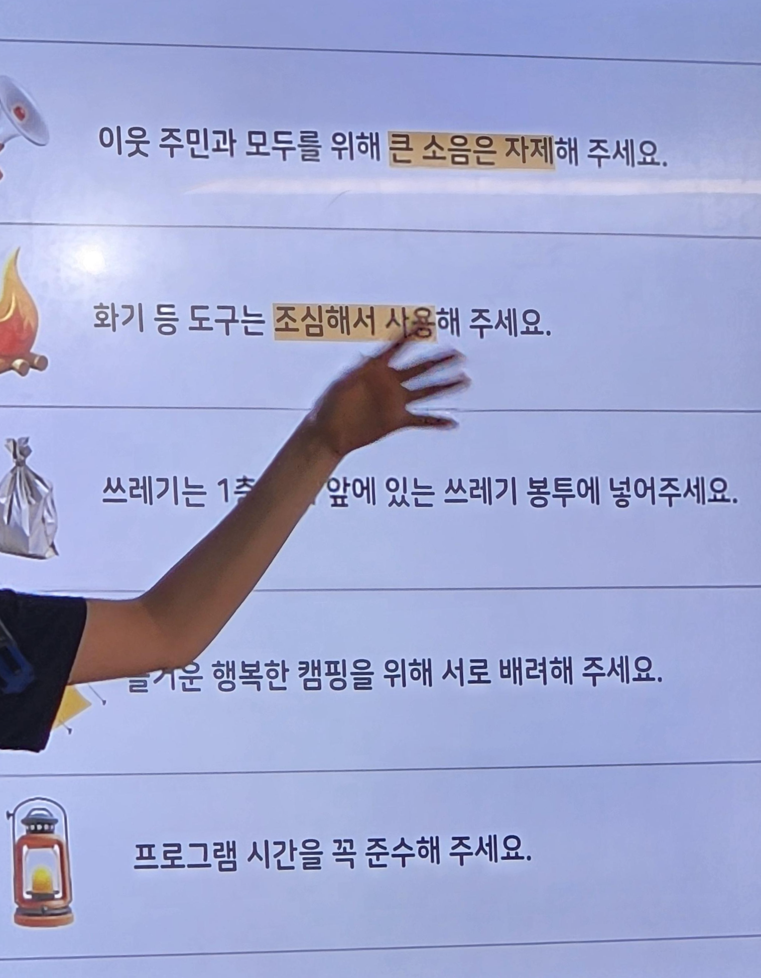 캠프가 시작되면서 모든 참가자들은 안전 교육을 받았습니다. 아래의 안전 사항들을 준수해야 합니다.